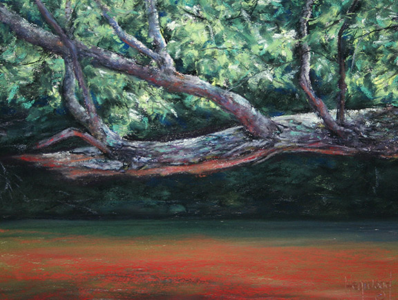 “Branch Over Red Water” original Heywood pastel painting, 8″ x 11″